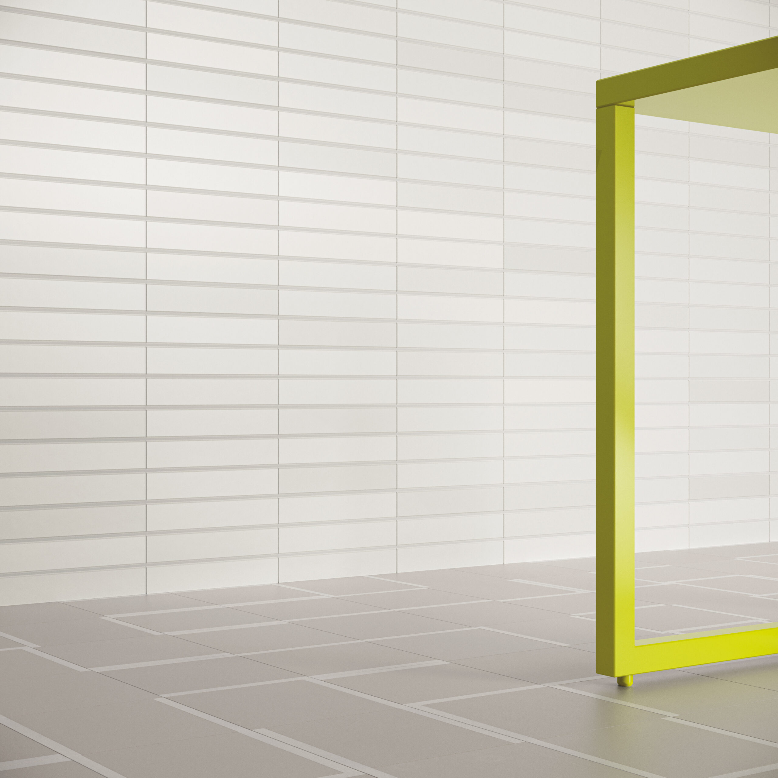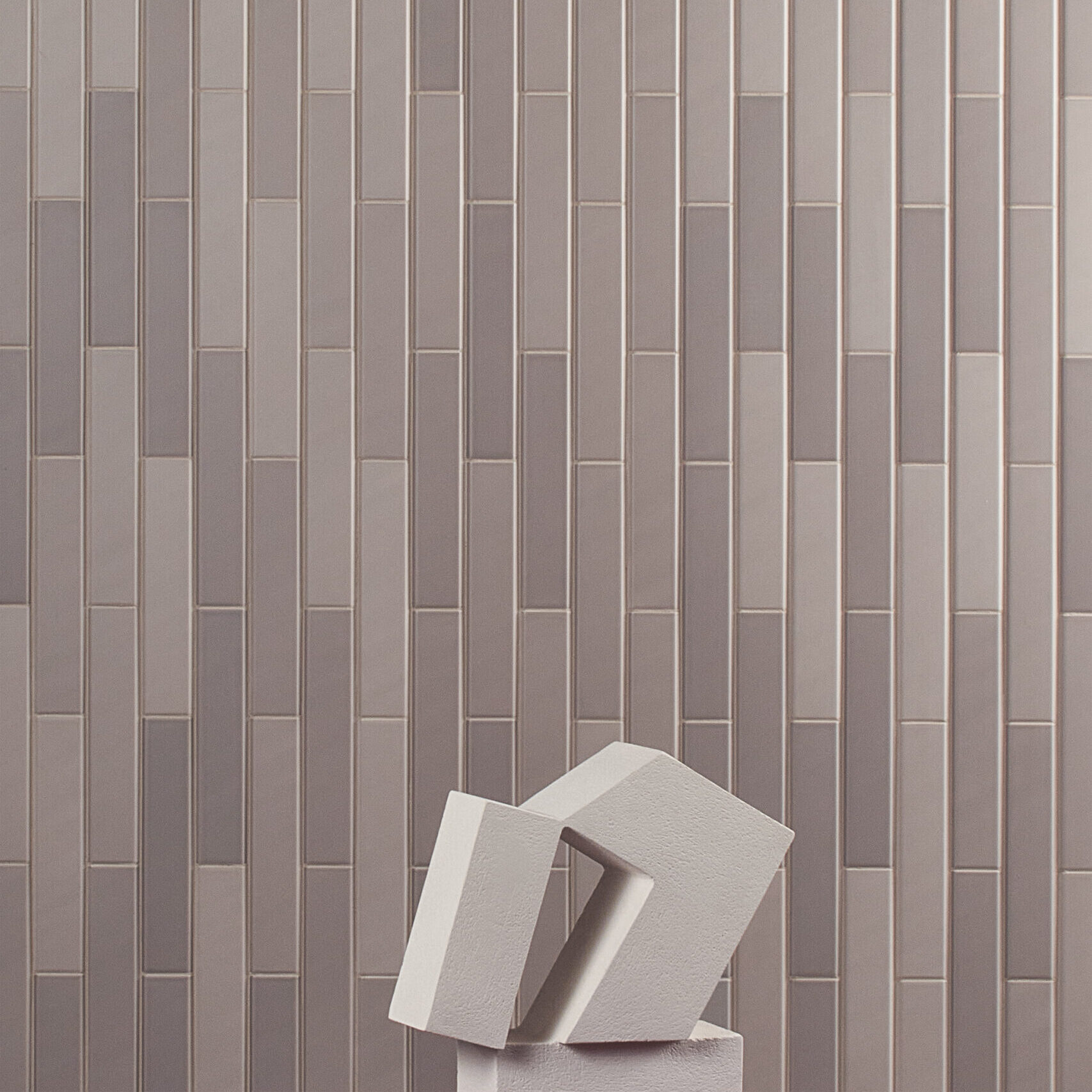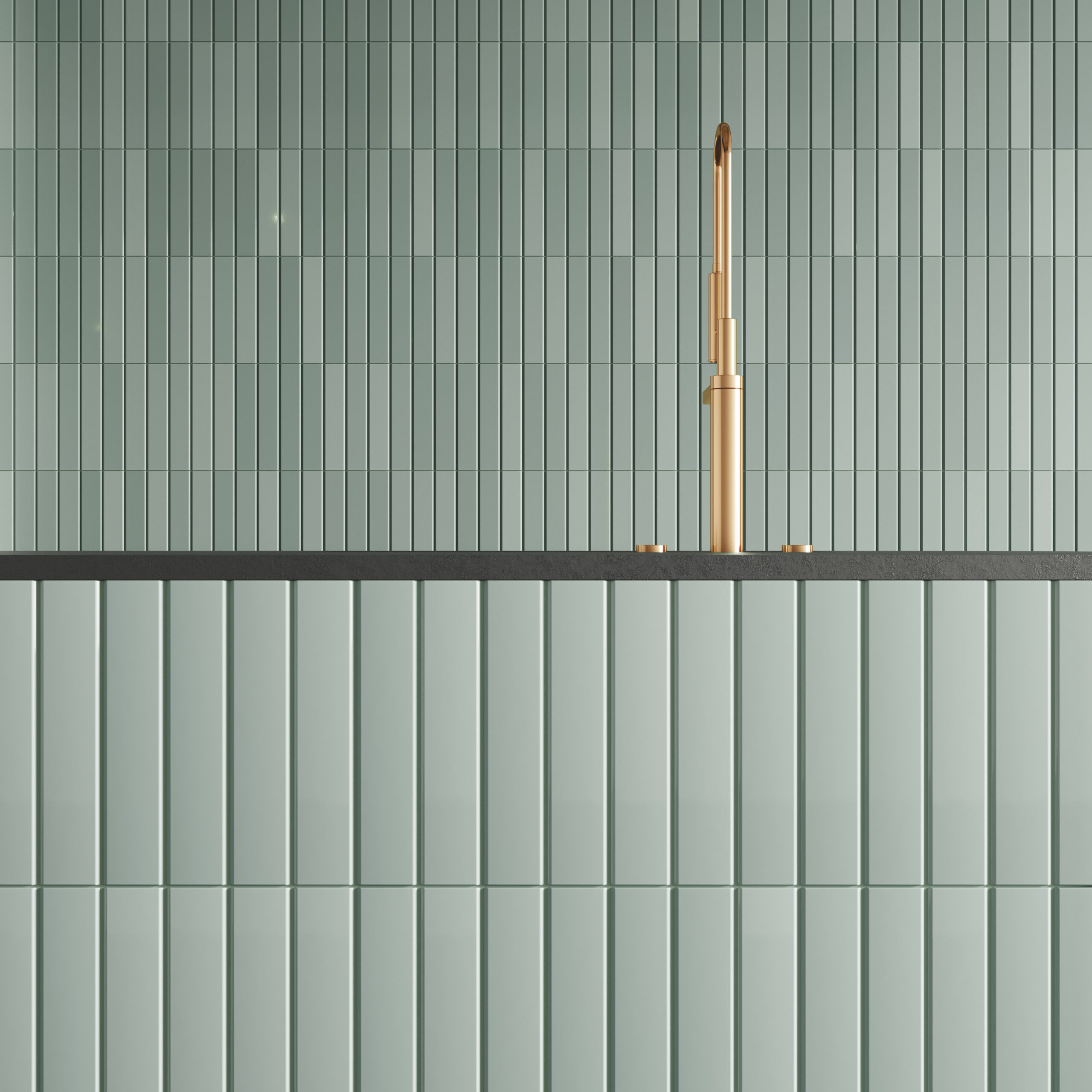 シンプルなボーダータイルの周囲にテーパを設けることで、奥行きを感じさせるシリーズ。使い勝手のいい白とブラウン、旬のミントグリーンのカラーバリエーションとマット、ブライトの2つの質感を用意しました。マット、ブライトの混ぜ張りが粋。