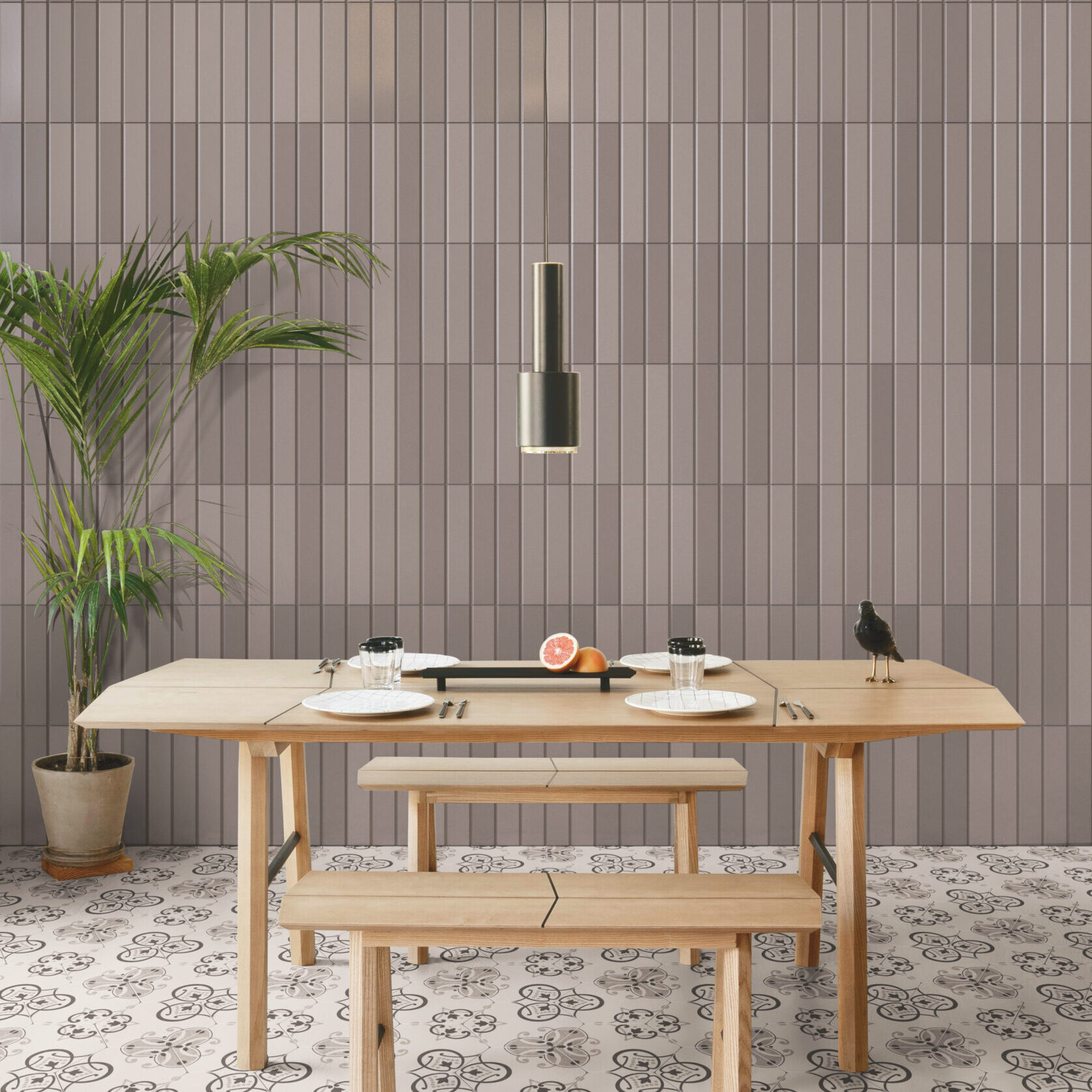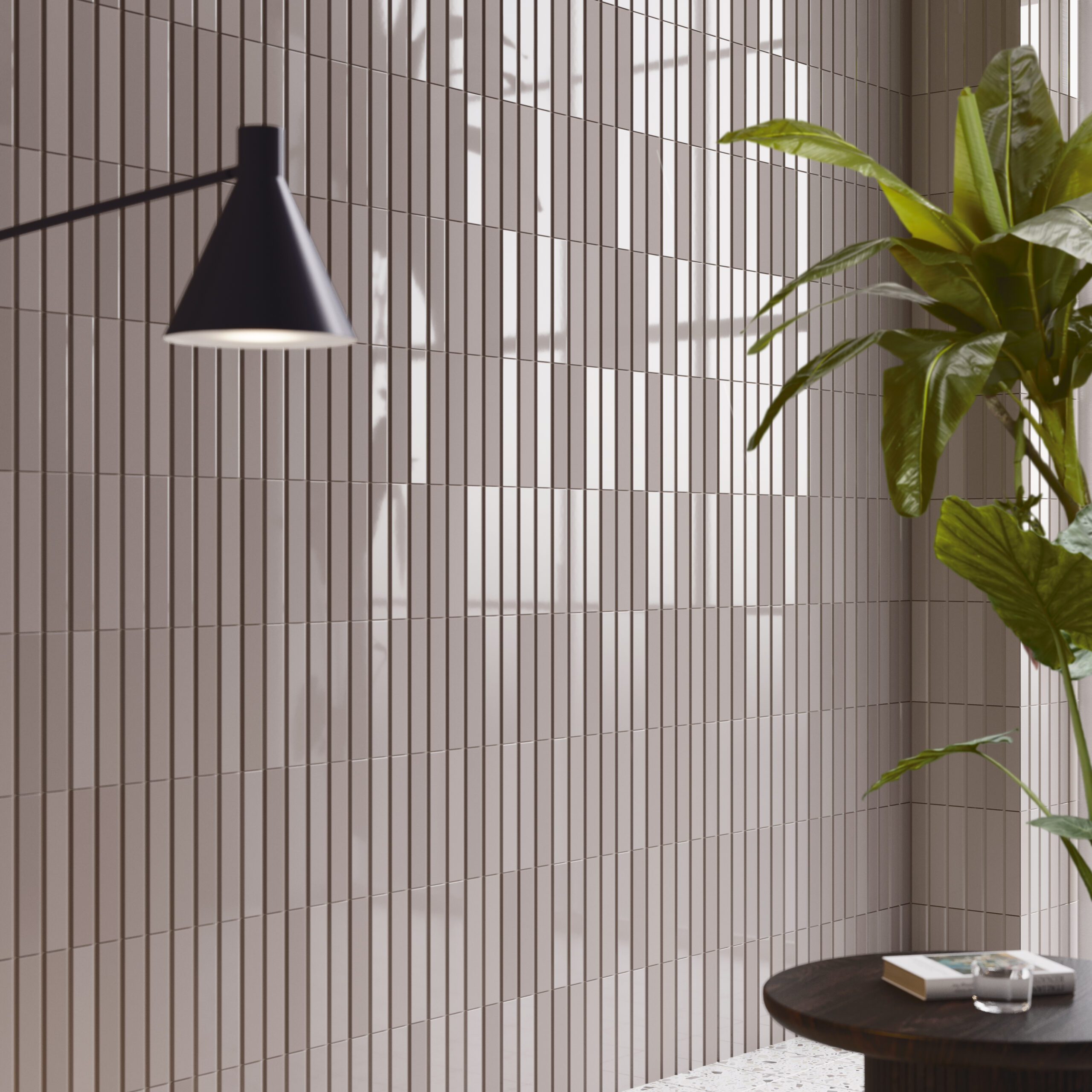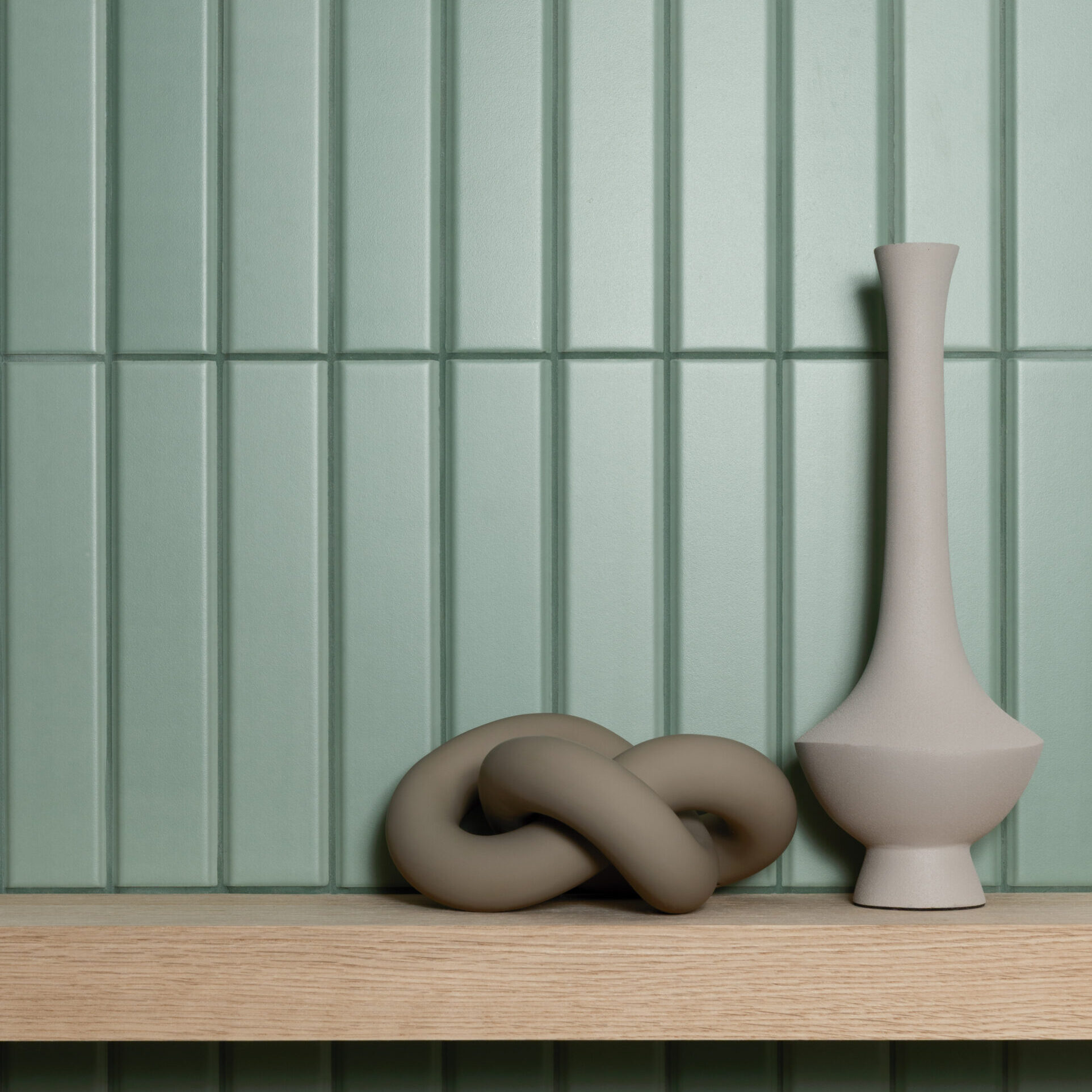 シンプルなボーダータイルの周囲にテーパを設けることで、奥行きを感じさせるシリーズ。使い勝手のいい白とブラウン、旬のミントグリーンのカラーバリエーションとマット、ブライトの2つの質感を用意しました。マット、ブライトの混ぜ張りが粋。