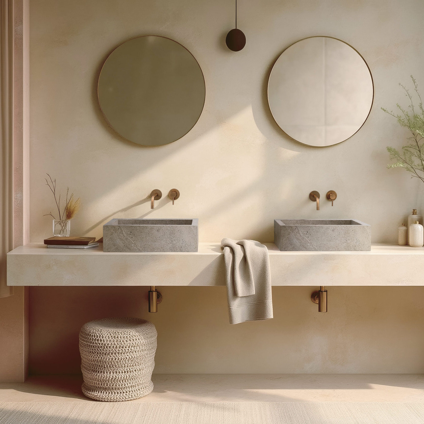 インテグラージュは、セラミックタイルを組み合わせた洗面ボウル。ベースには高性能な防水材を使用し、熟練の職人が一台ずつ丁寧に仕上げています。インテグラージュカウンターとの組み合わせで、一体感のある石材のような洗練された演出が可能です。耐薬品性、耐摩耗性、耐久性に優れ、汚れも簡単にお手入れできるセラミック素材で、メンテナンスもラクラク。 機能性と美しさを兼ね備えた、アクアピアならではの新しい提案です。