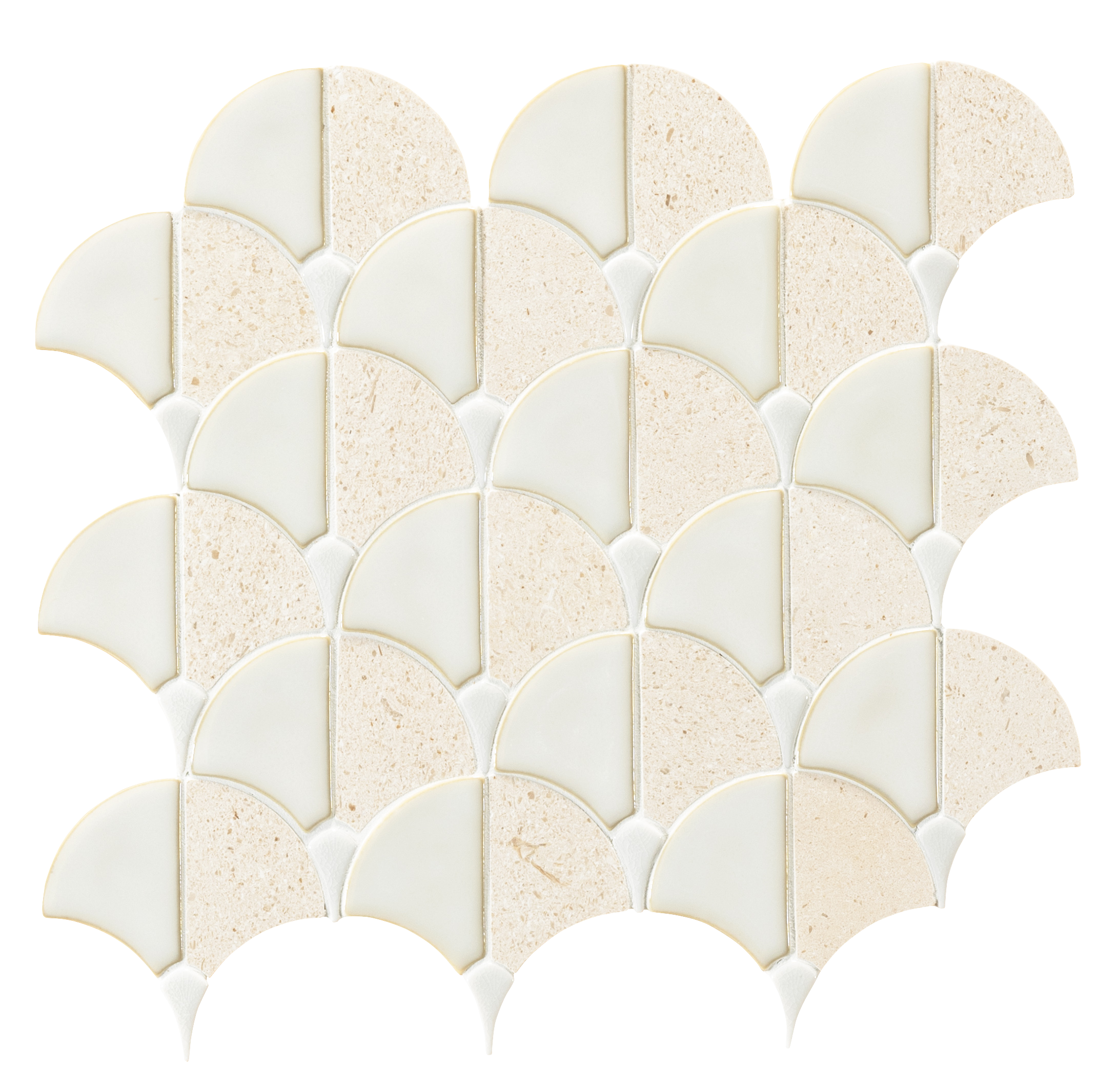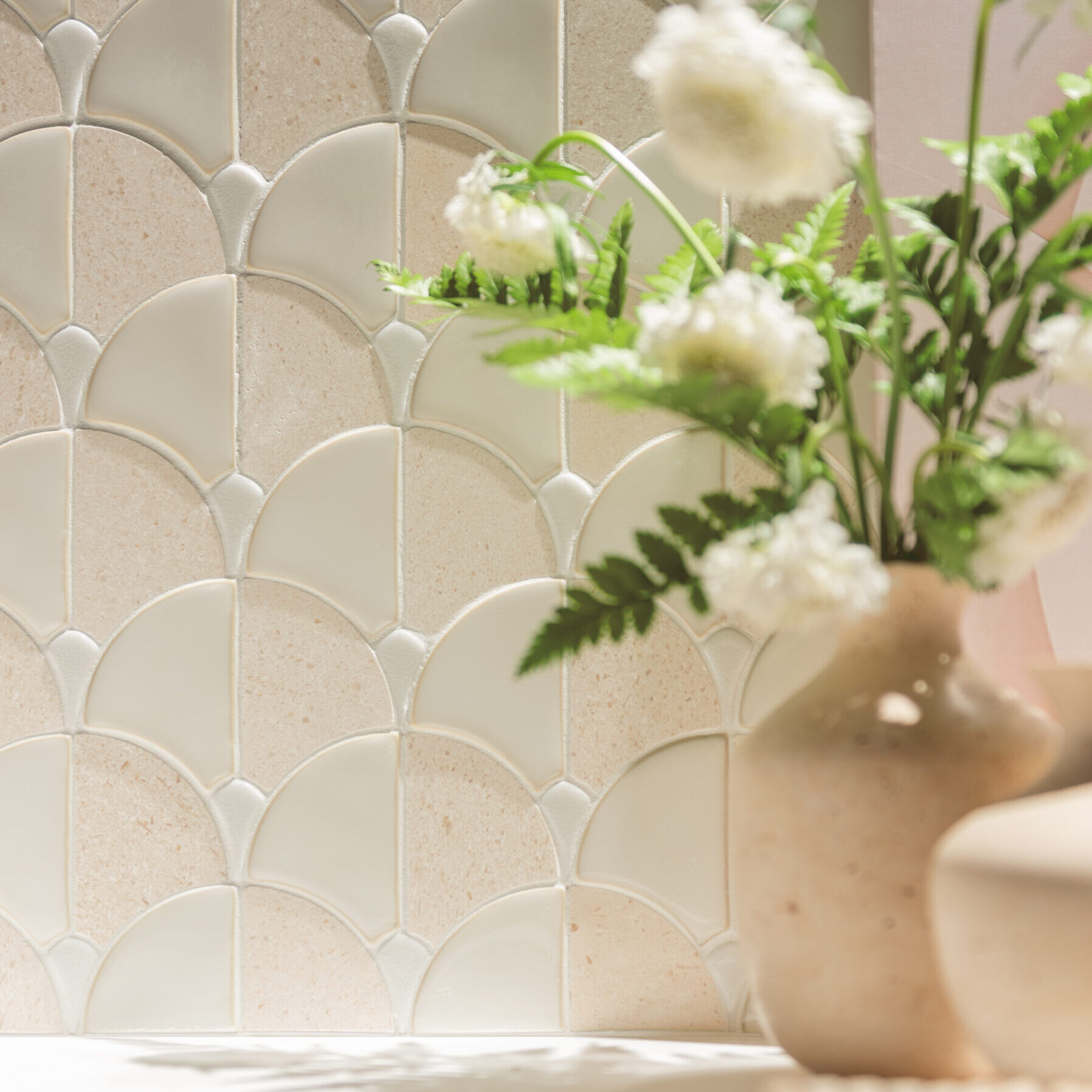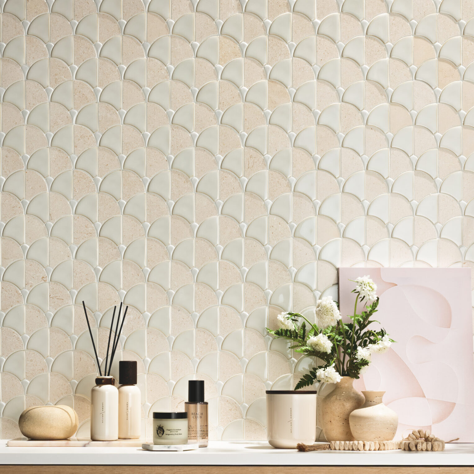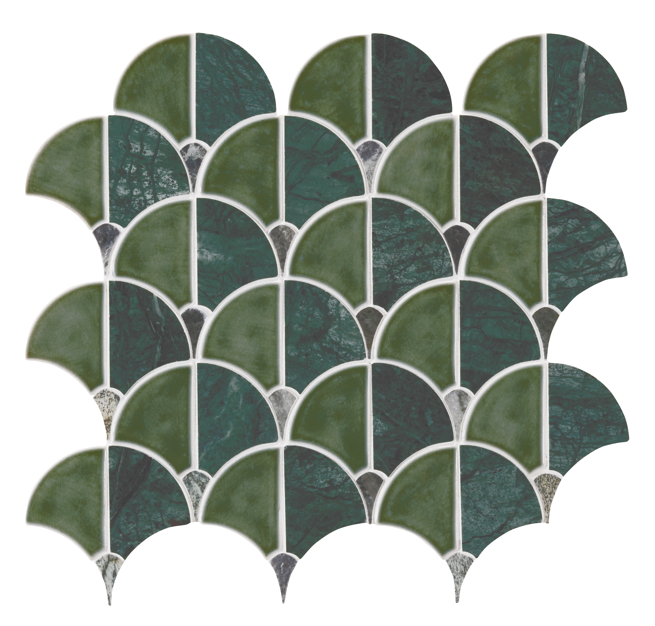 大理石モザイクと施釉ガラスモザイクを組み合わせたイチョウ形のタイル。異なるテクスチャーのコンビネーションで空間にメリハリと華やかさをもたらします。ベージュはポルトガル産のトラバーチン、グリーンはインド産のヴェルデアルピを採用しました。