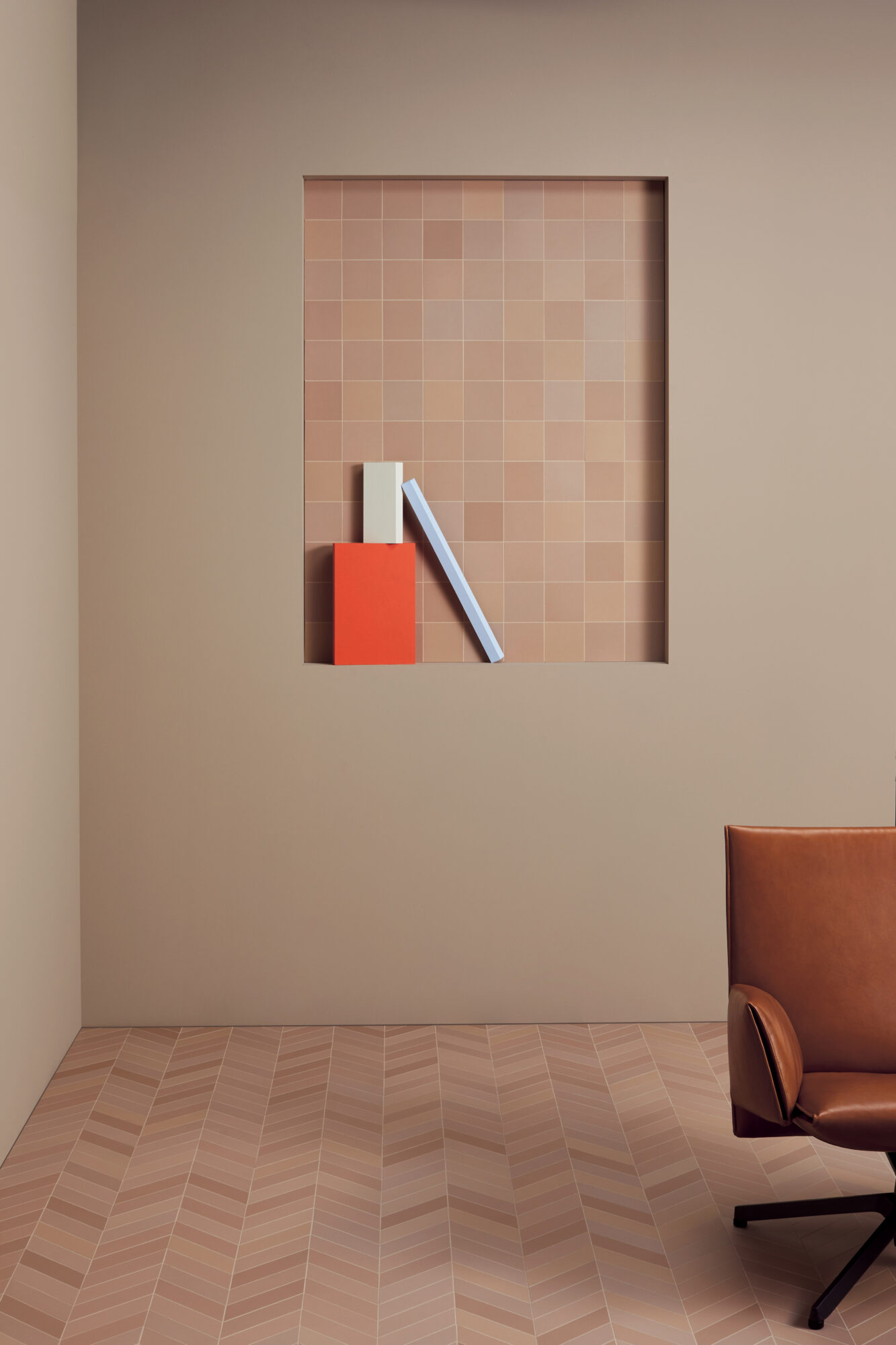 ロンドンの街にインスパイアされた3つのベースカラーを中心に深みのあるシェイド感 などを組み合わせ、 9種類のバリエーションが創り出されました。 ニュアンスのある多様な表情が味わえるシリーズです。 トレンドのシェブロン形状による不規則な色合いの幾何学的な パターンがモダンな雰囲気を演出。床・壁の両方に使用できます。 Designed by Edward Barber & Jay Osgerby for Mutina