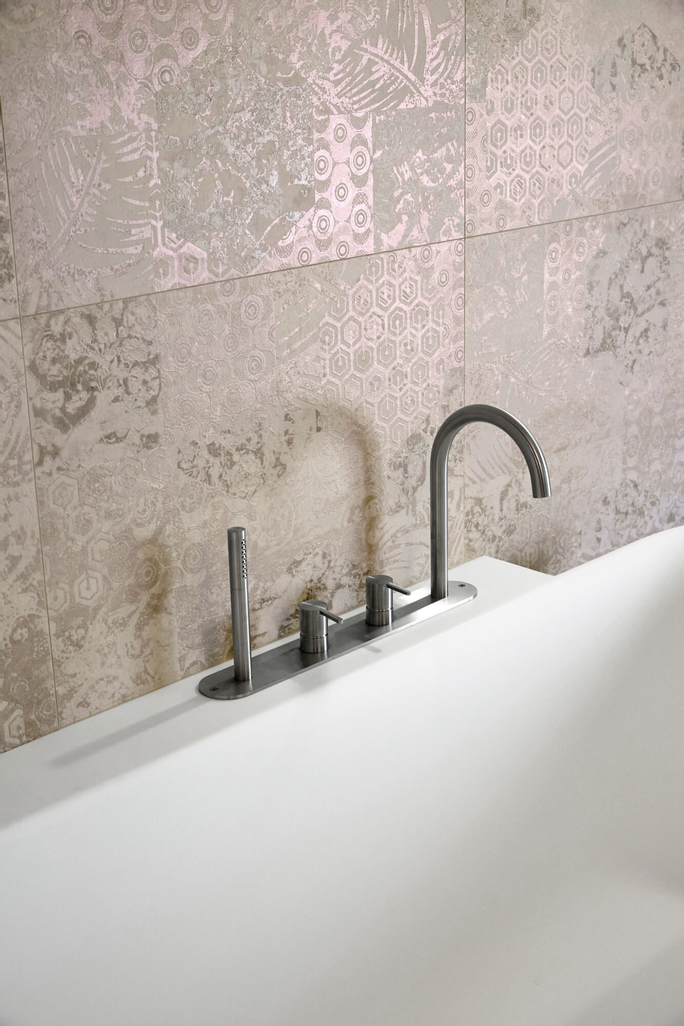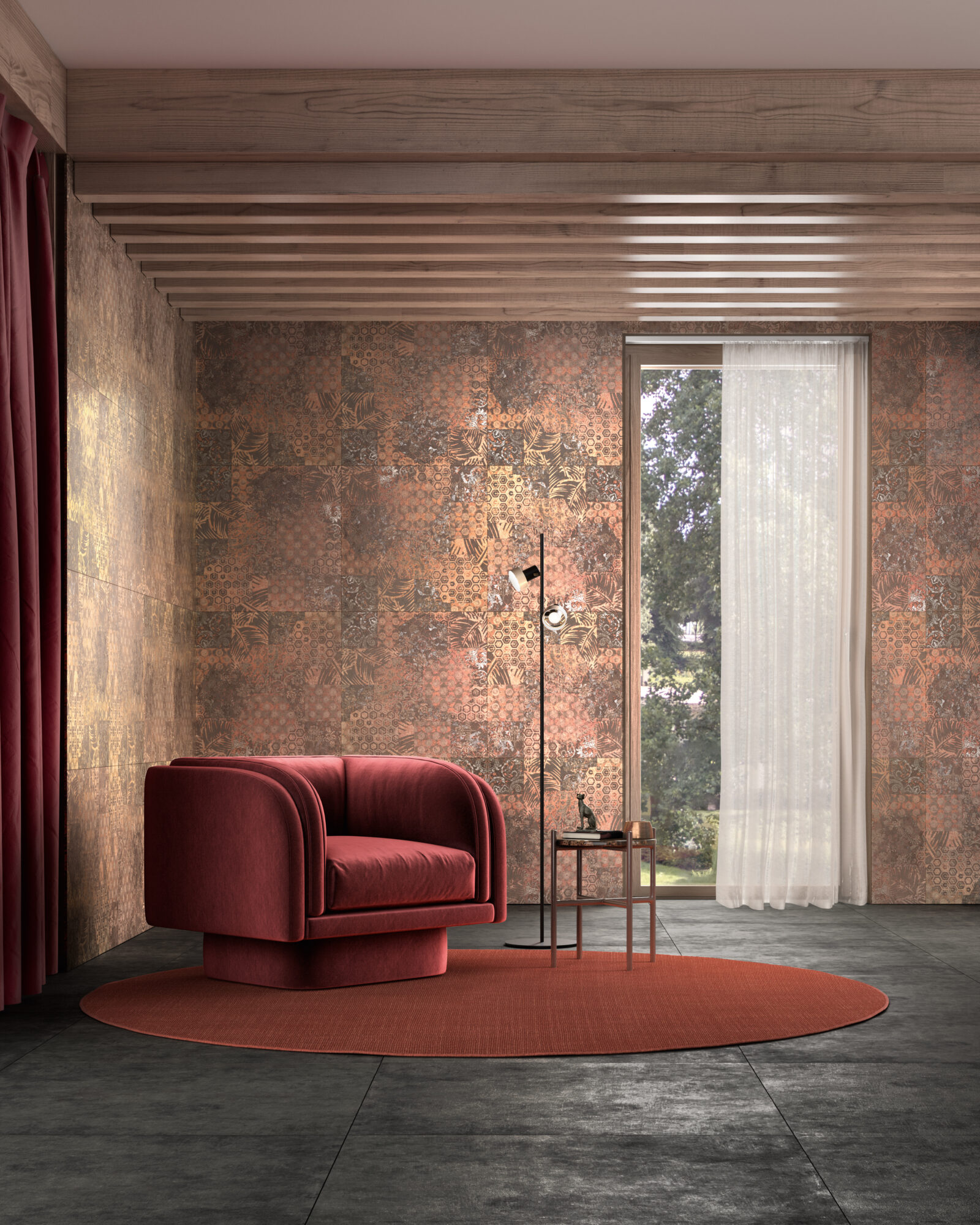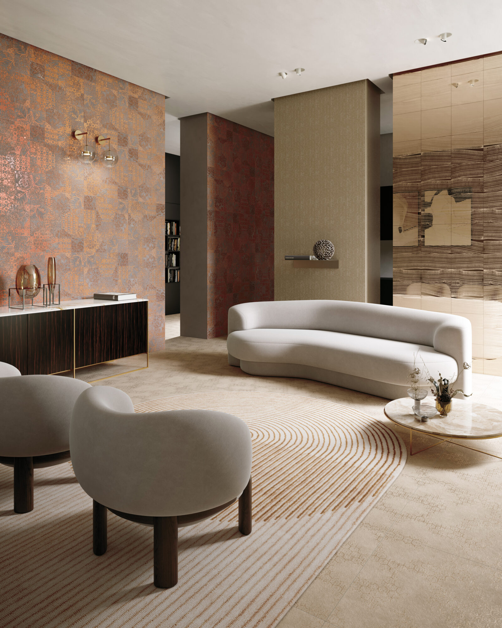 夕日に照らされて移り変わるヴェネツィア大運河の光と色を、特殊な釉薬を用いて表現したシリーズ。このダイナミックでアーティスティックなデザインは、これまでのタイル装飾の枠を凌駕しており、他に類を見ない絵画的な空間創造を実現します。