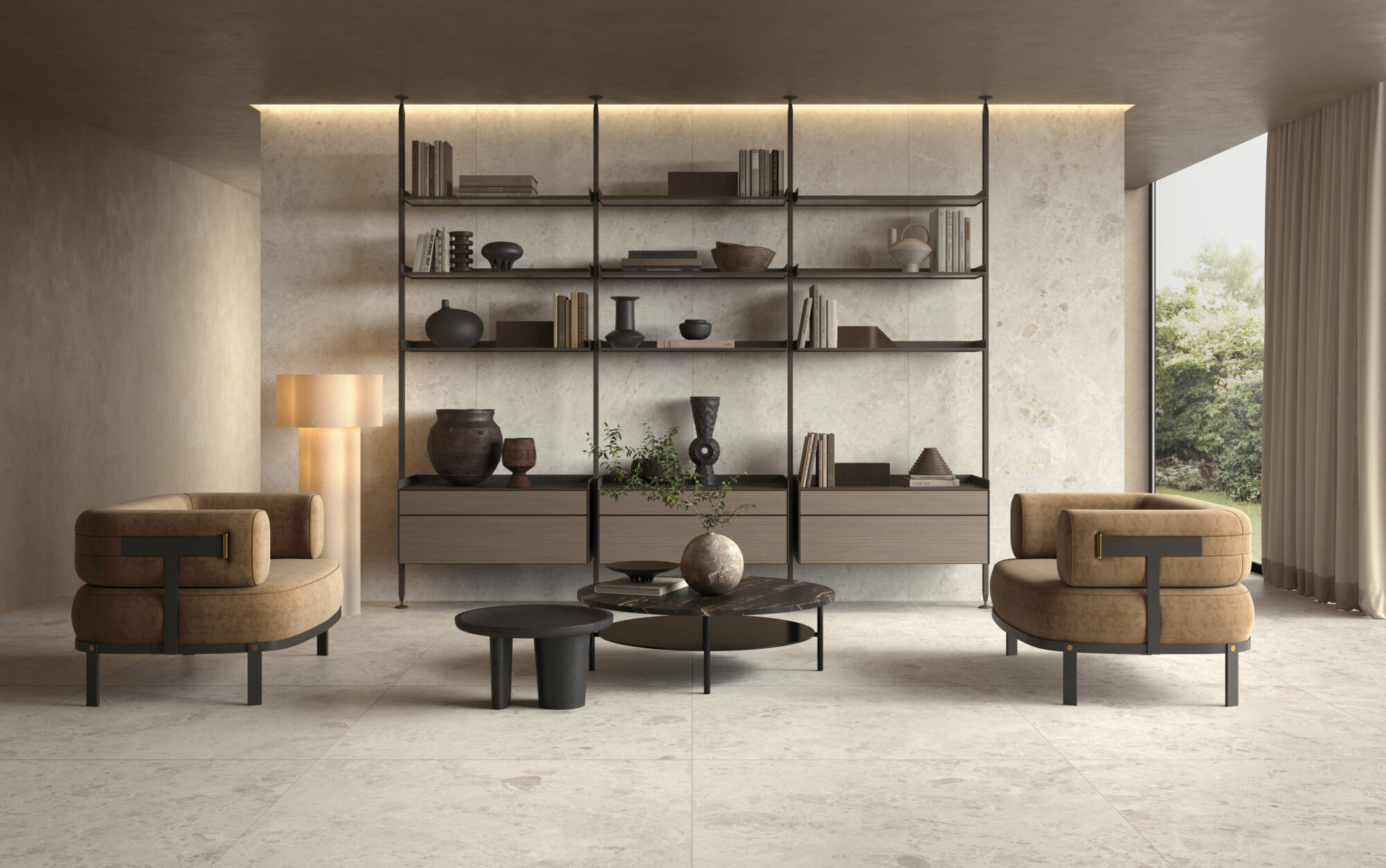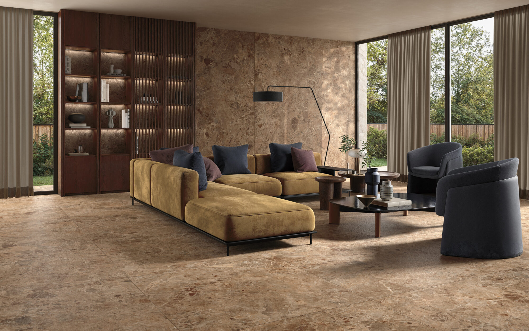 イタリアで採掘される「BRECCIA PARADISO(ブレッチア・パラディソ)」がモチーフ。マット仕上げは3Dインクジェットプリントによって、タイル表面にリアルな溝(粒感)を表現しています。優雅でクラシックな表情でありながら、空間へインパクトのある生命感を与えます。
