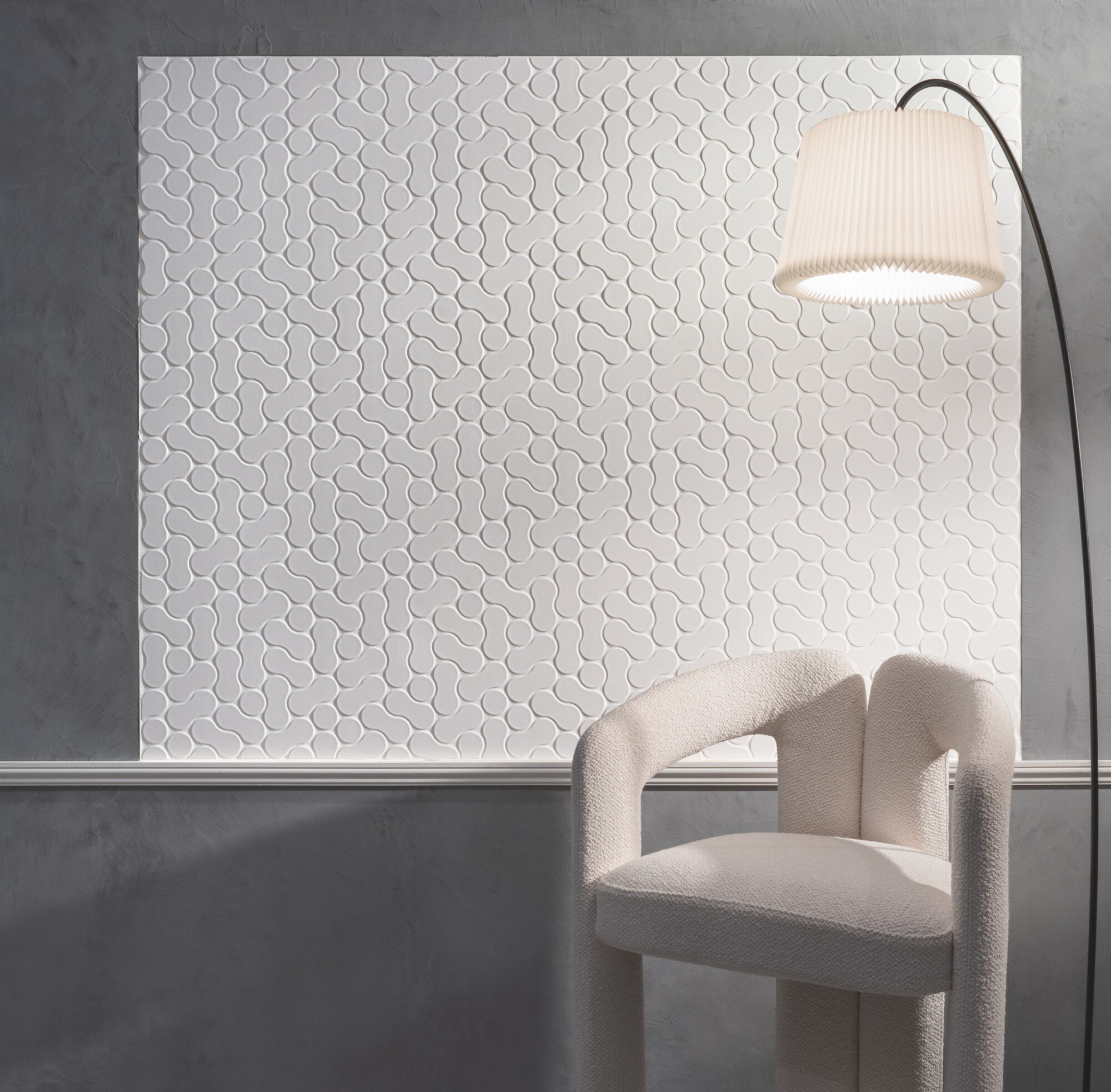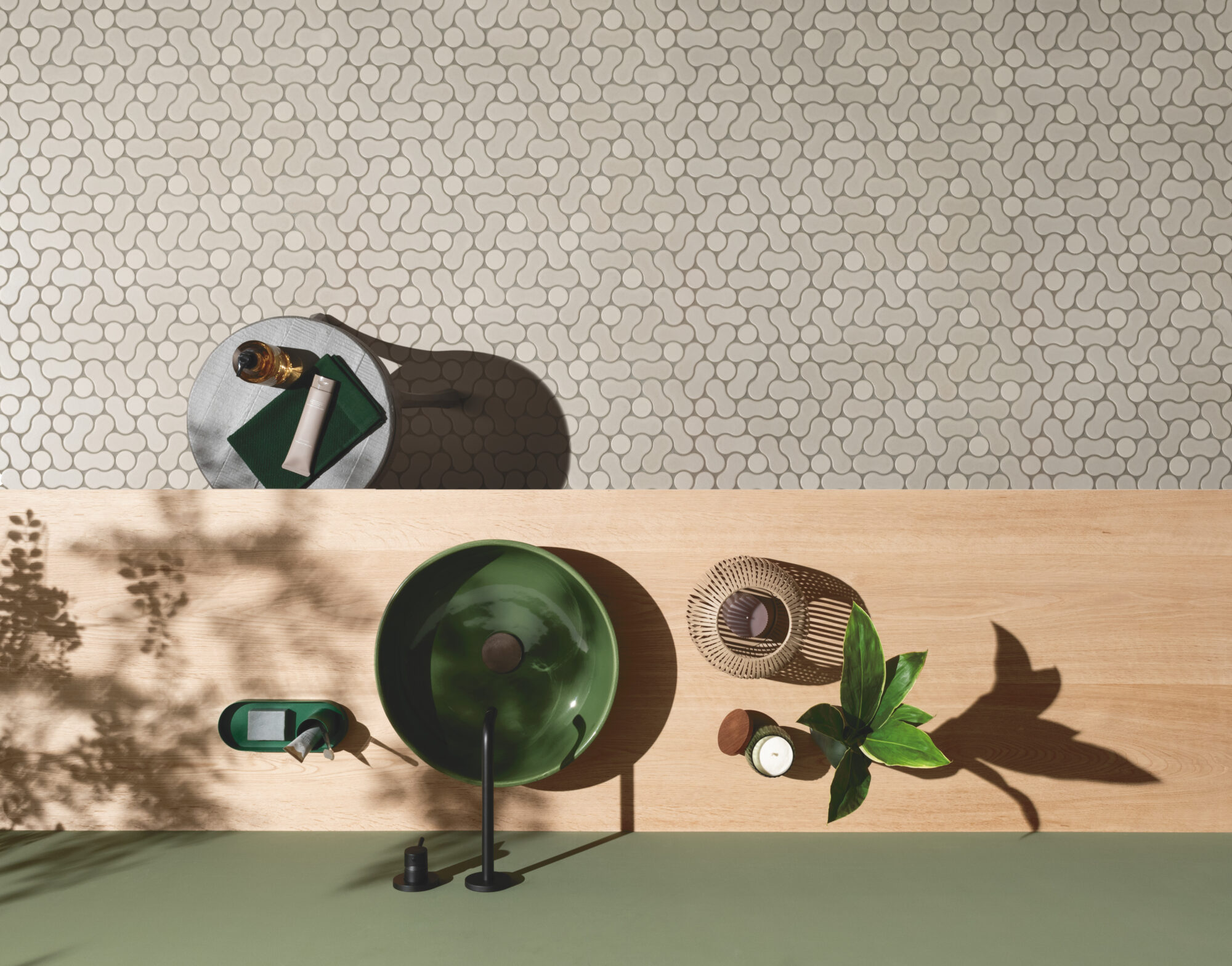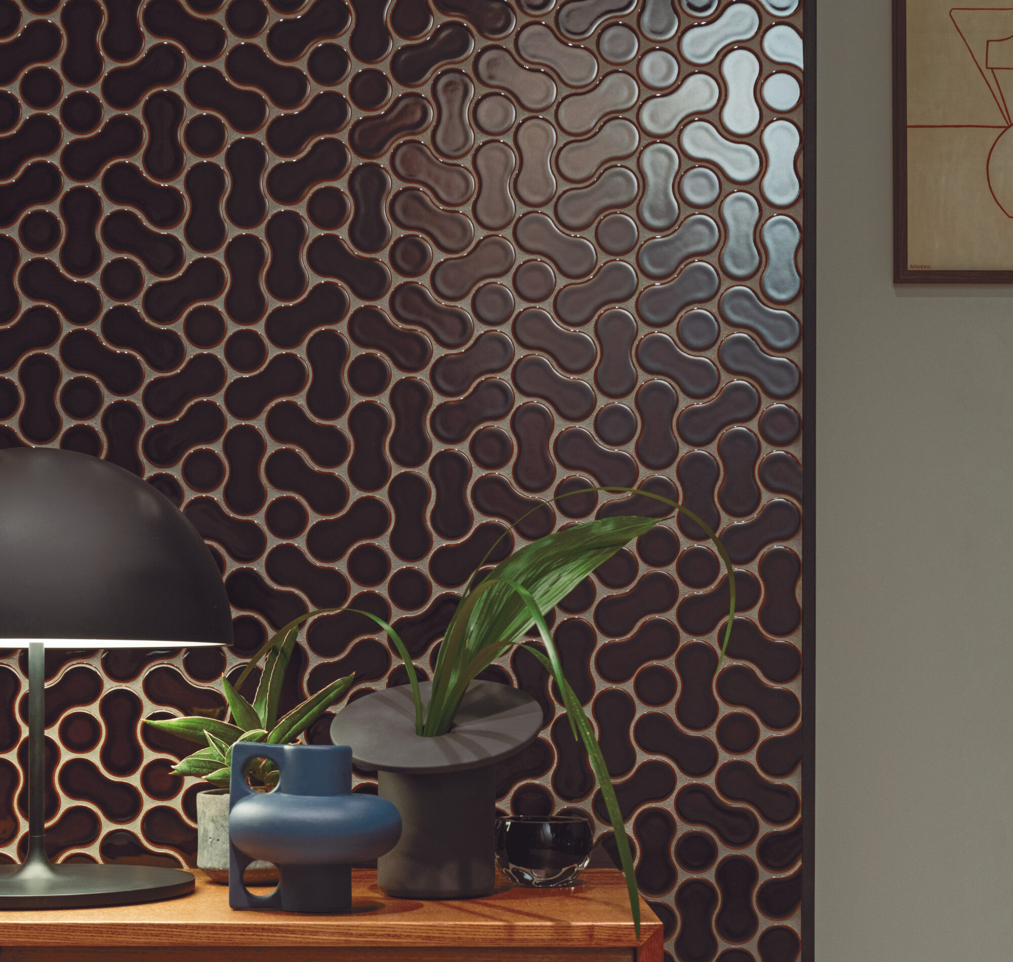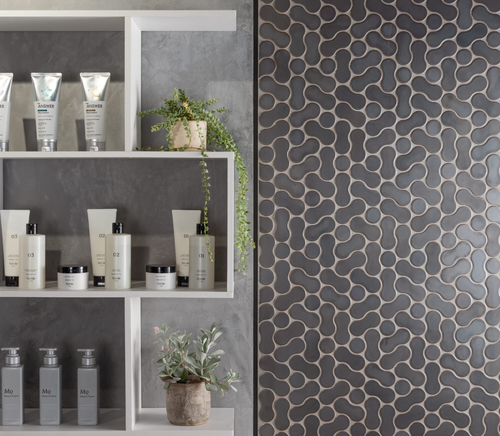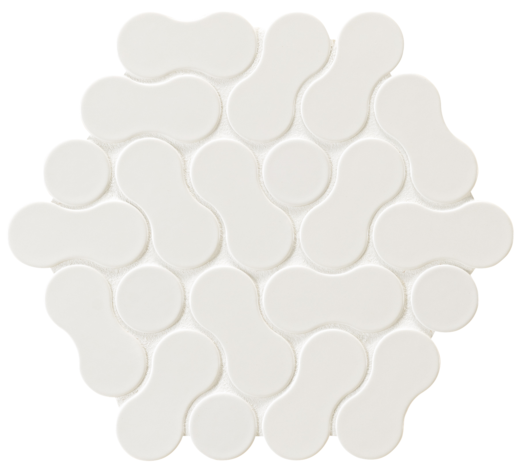 ラウンドパターンとピーナッツパターンのコンビネーションデザイン。 カラーは高級感のあるツヤ色の飴茶とメタルグレー、清潔感あふれるマット色のホワイトとベージュを取り揃えました。 耐久性に優れた磁器モザイクなので、壁にも床にもマルチに対応できます。