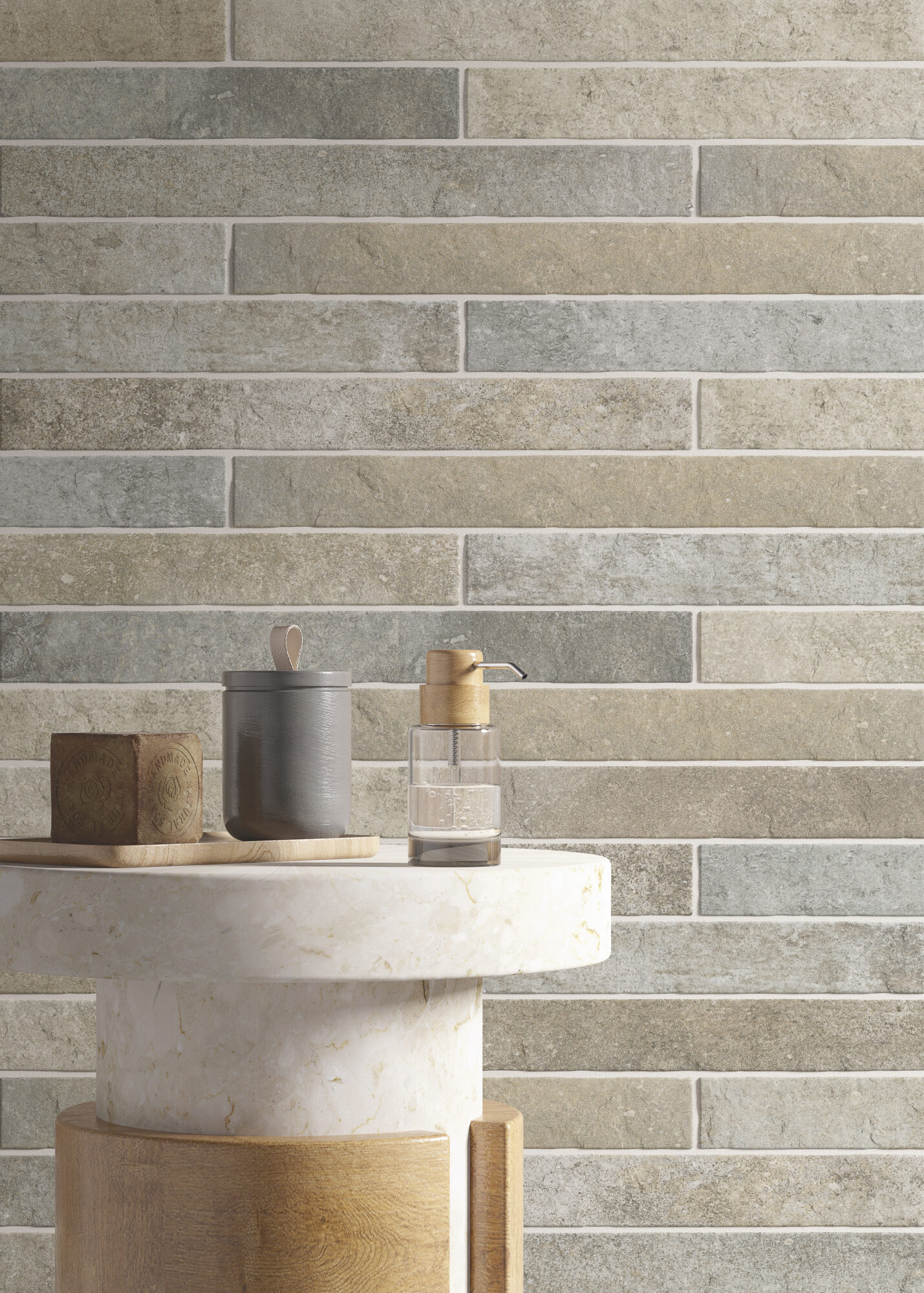 昔ながらの磁器タイルの質感と、くすみカラーやスレンダーな形状の調和により、空間に洗練された雰囲気をもたらします。 ザラつきのあるテクスチャーにより、インドアとアウトドア、さまざまな空間シーンへの調和を可能にしました。