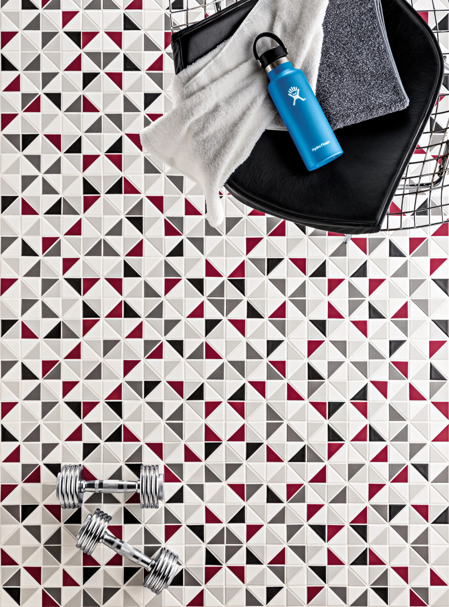 新たなトレンドとして注目されているジオメトリックパターンを小粋に表現。やや懐かしいレトロ感と今の空気感がほどよく調和しています。落ち着きのあるモノトーンをベースに、オリーブ、イエロー、ワインのアクセントカラーをポップにあしらった多色使いに、新たにホワイト、グレーの単色使いが加わりました。特に単色使いは、目地の色を替えれば違った雰囲気に。マットの質感とアートのようなレイアウトが洒落た空間へとランクアップさせます。
