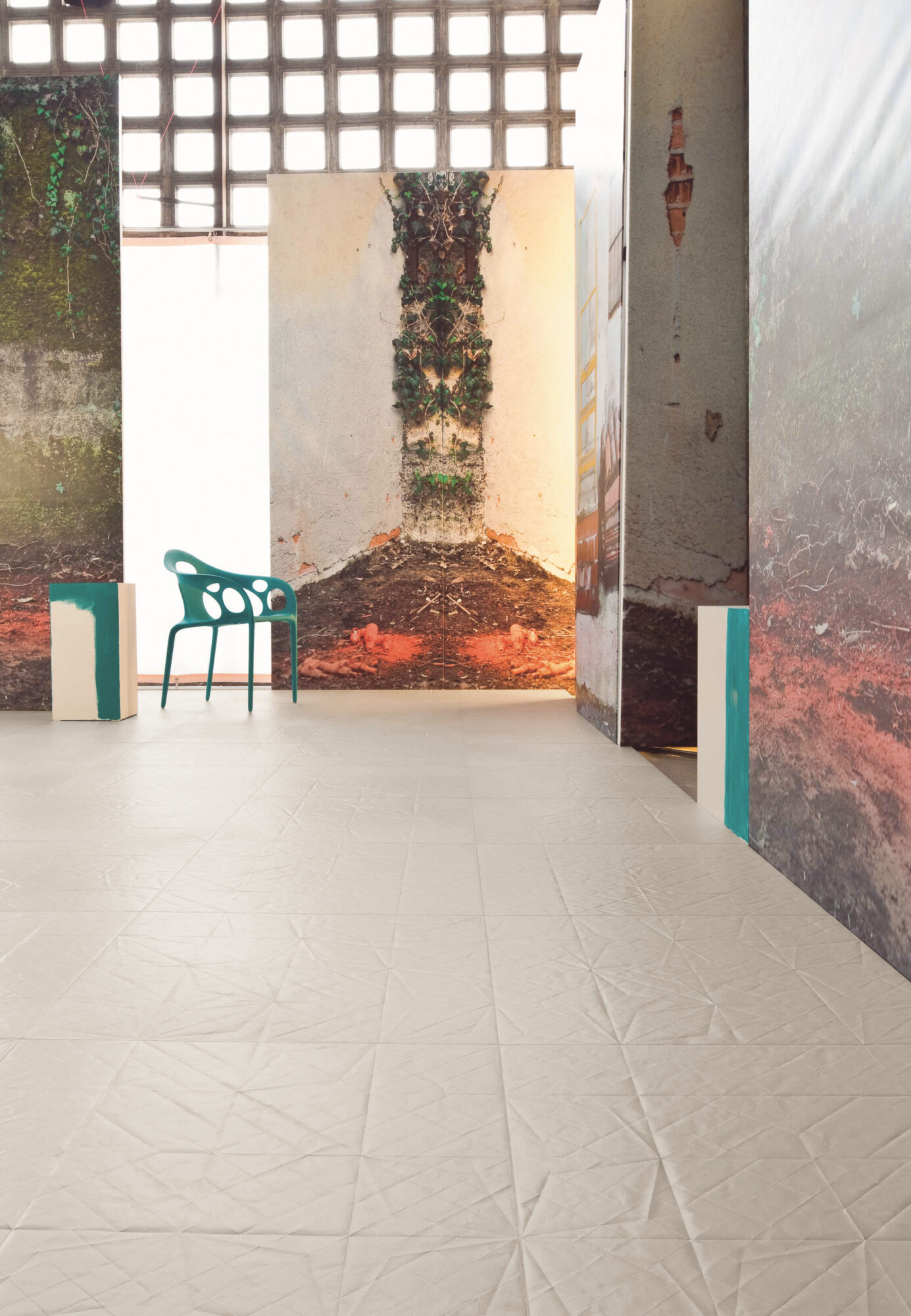 Foldedは、50年代から60年代にかけてテルアビブのアパートメントに見られた伝統的な陶磁器の模様からインスピレーションを得ています。ロウ・エッジズは、セラミック素材に折り紙の効果を再現することを考え、ニュートラルで繊細な色調の600角のフォーマットで作品を制作しました。