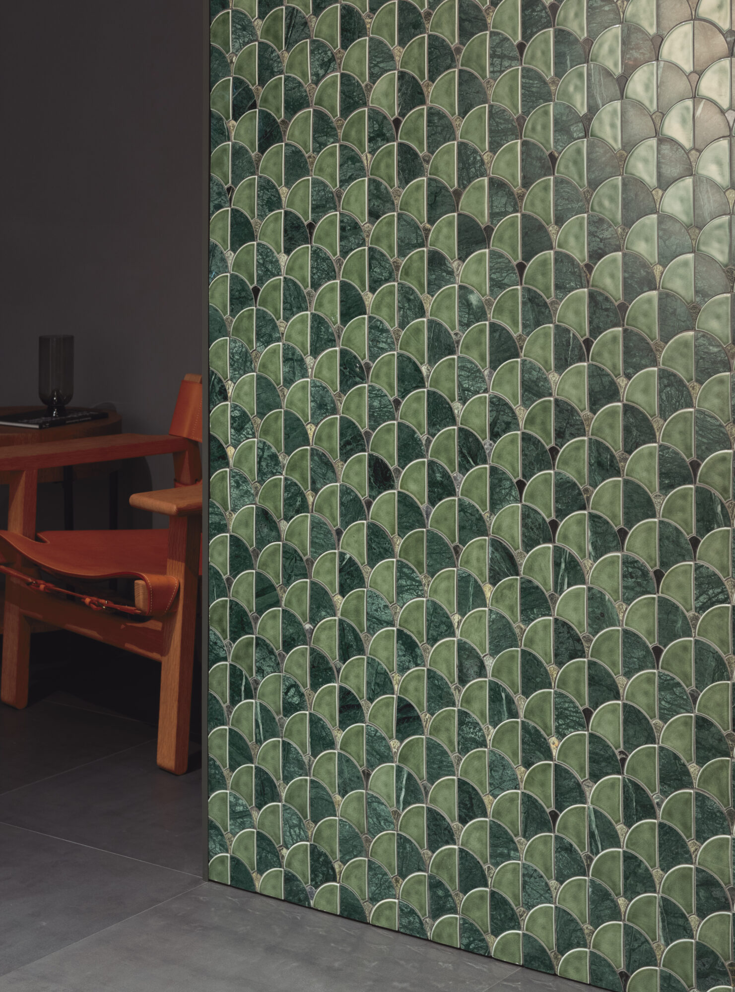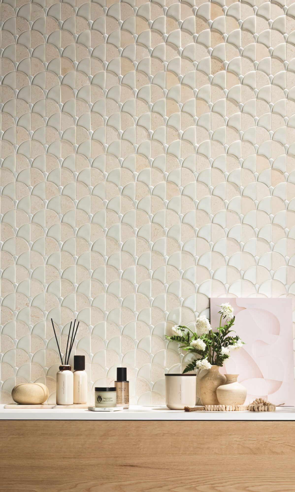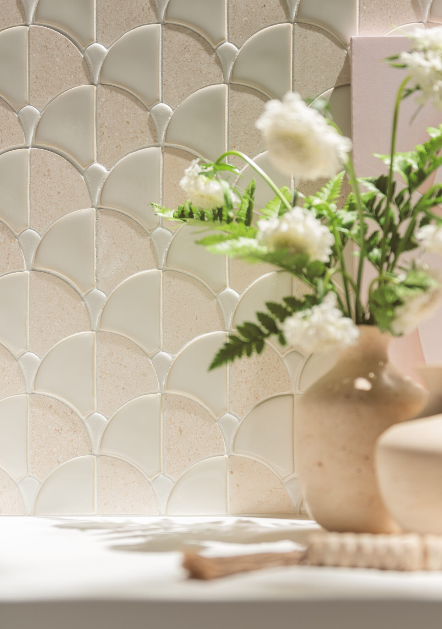 大理石モザイクと施釉ガラスモザイクを組み合わせたイチョウ形のタイル。異なるテクスチャーのコンビネーションで空間にメリハリと華やかさをもたらします。ベージュはポルトガル産のトラバーチン、グリーンはインド産のヴェルデ アルピを採用しました。