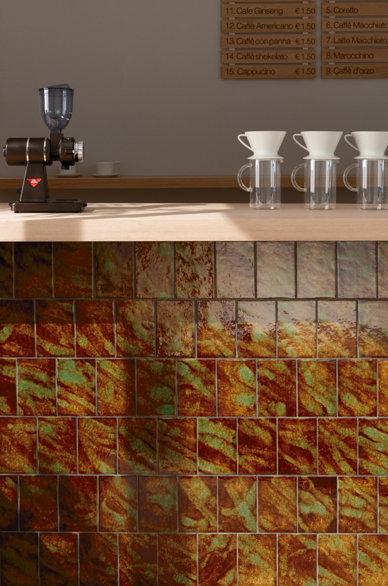 窯変による偶然の産物を楽しむシリーズ。釉薬の塗り厚や窯内の位置で生まれる濃淡など、手作業ならではのクラフト感が独特の味わいを醸し出しています。小口平を大きくしたような形状が珍しく、縦張りでも横張りでもしっくりキマります。