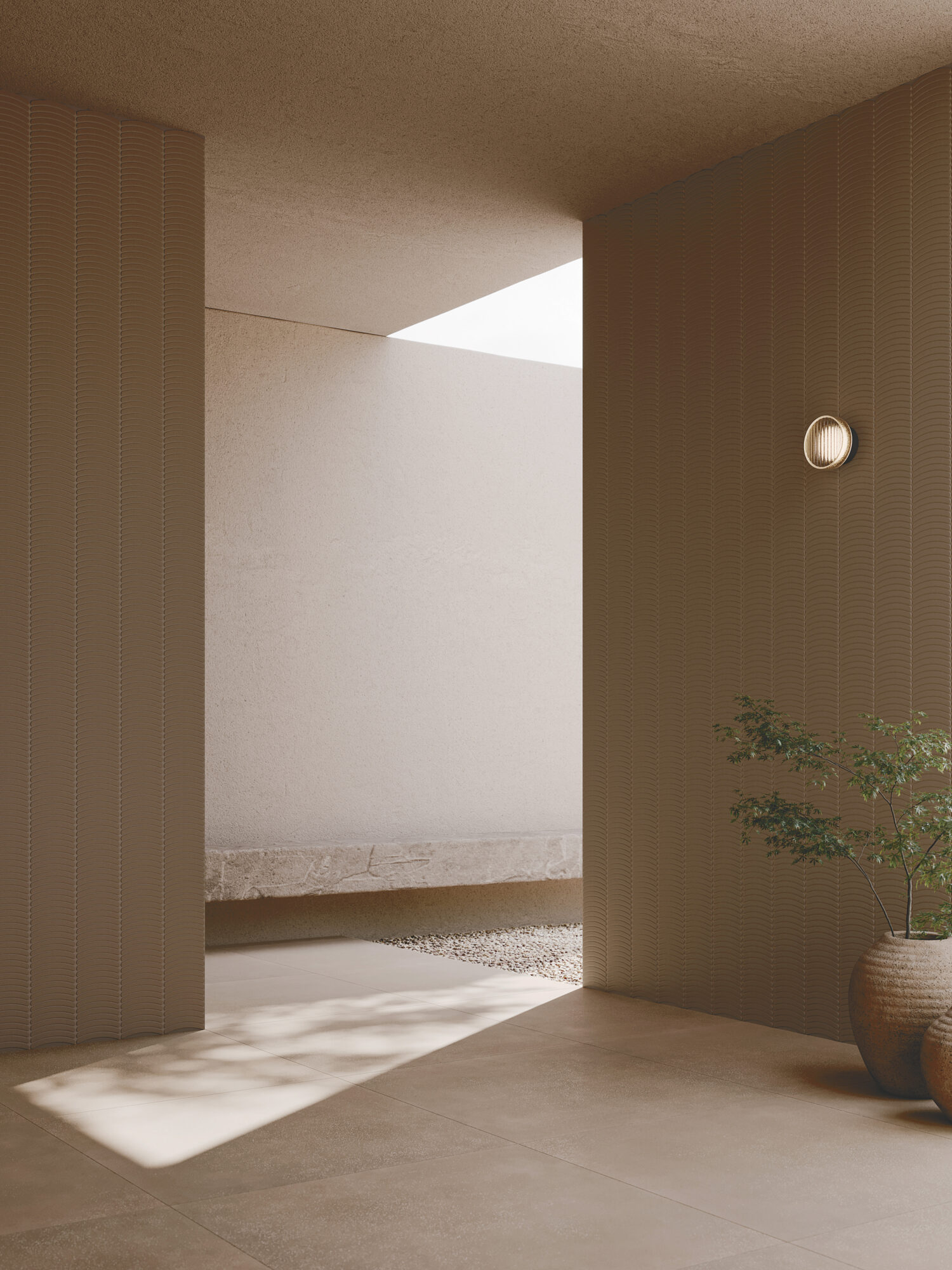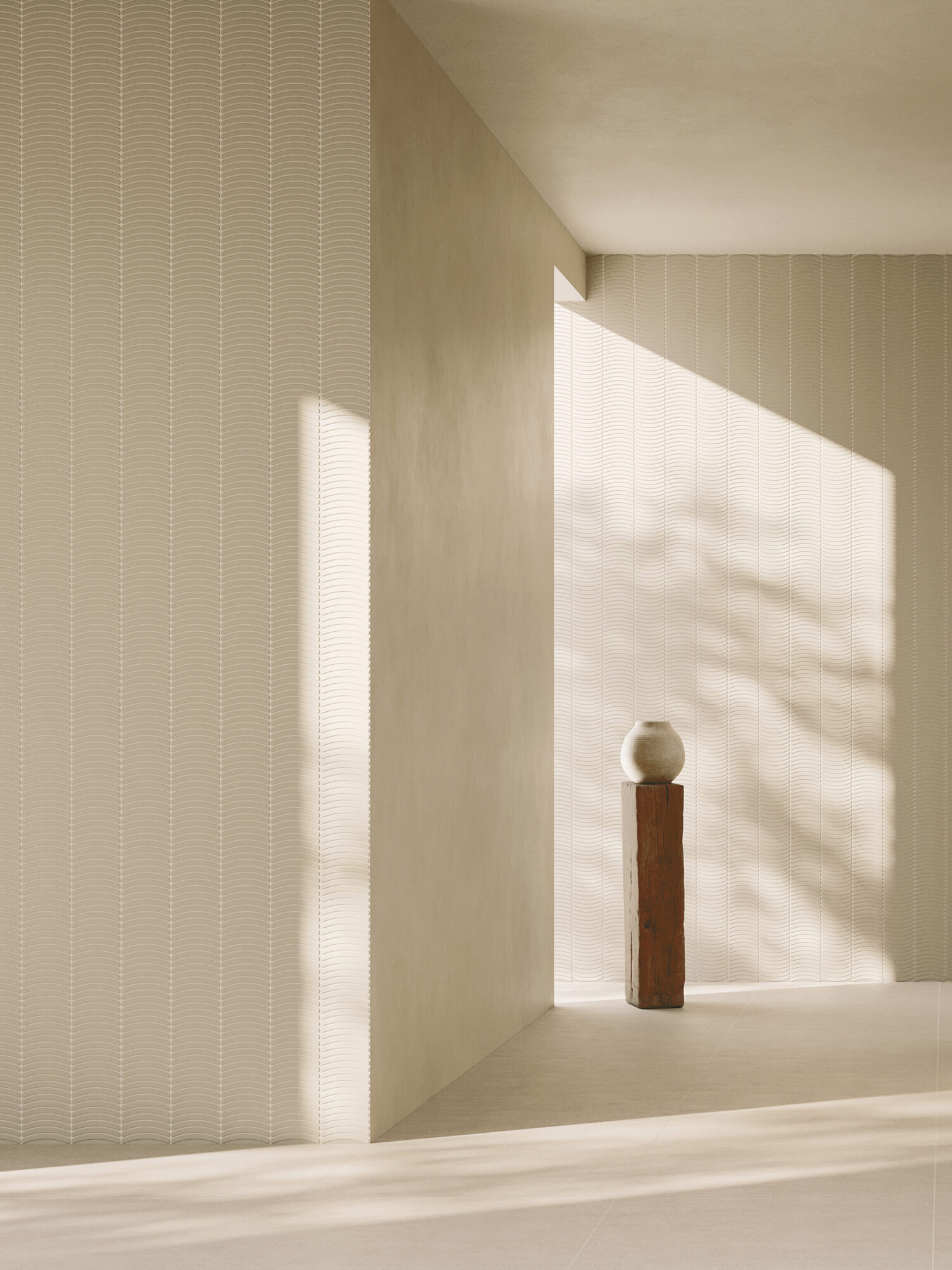 フェデリカ・ビアージがデザインした「ワ」は、中国瓦が積み重なっている様子から着想を得たコレクション。表面に入れたスリット(溝)に目地を入れることで初めてデザインが完成します。独創的なフォルムを際立たせるニュートラルな3色を用意。